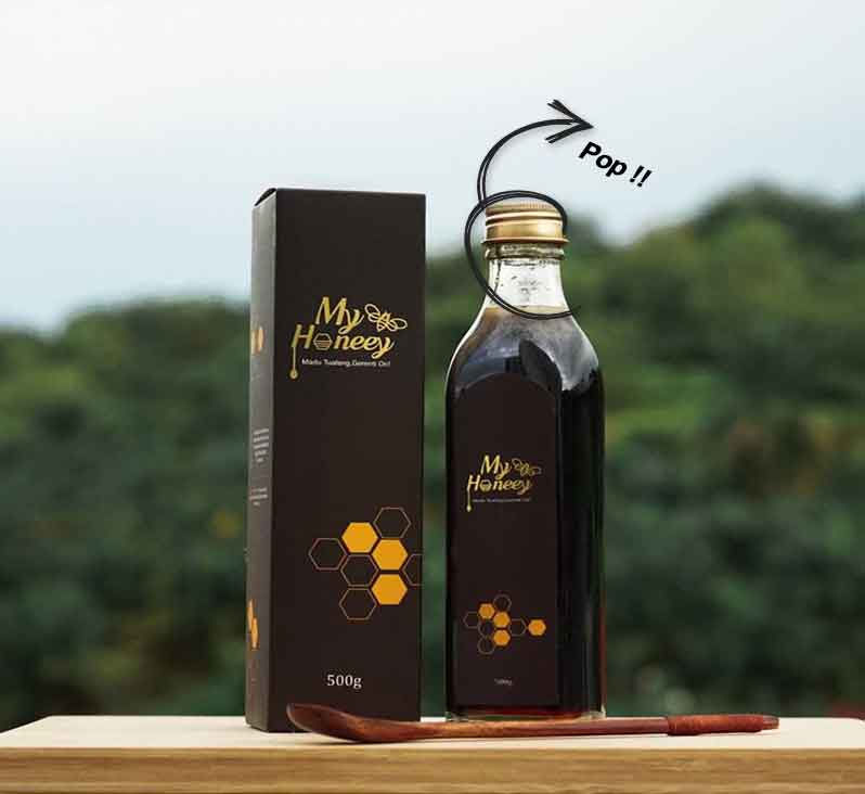 Bila penutup dibuka, ada bunyi ‘pop’ kerana madu Tualang asli berfermentasi secara semulajadi.